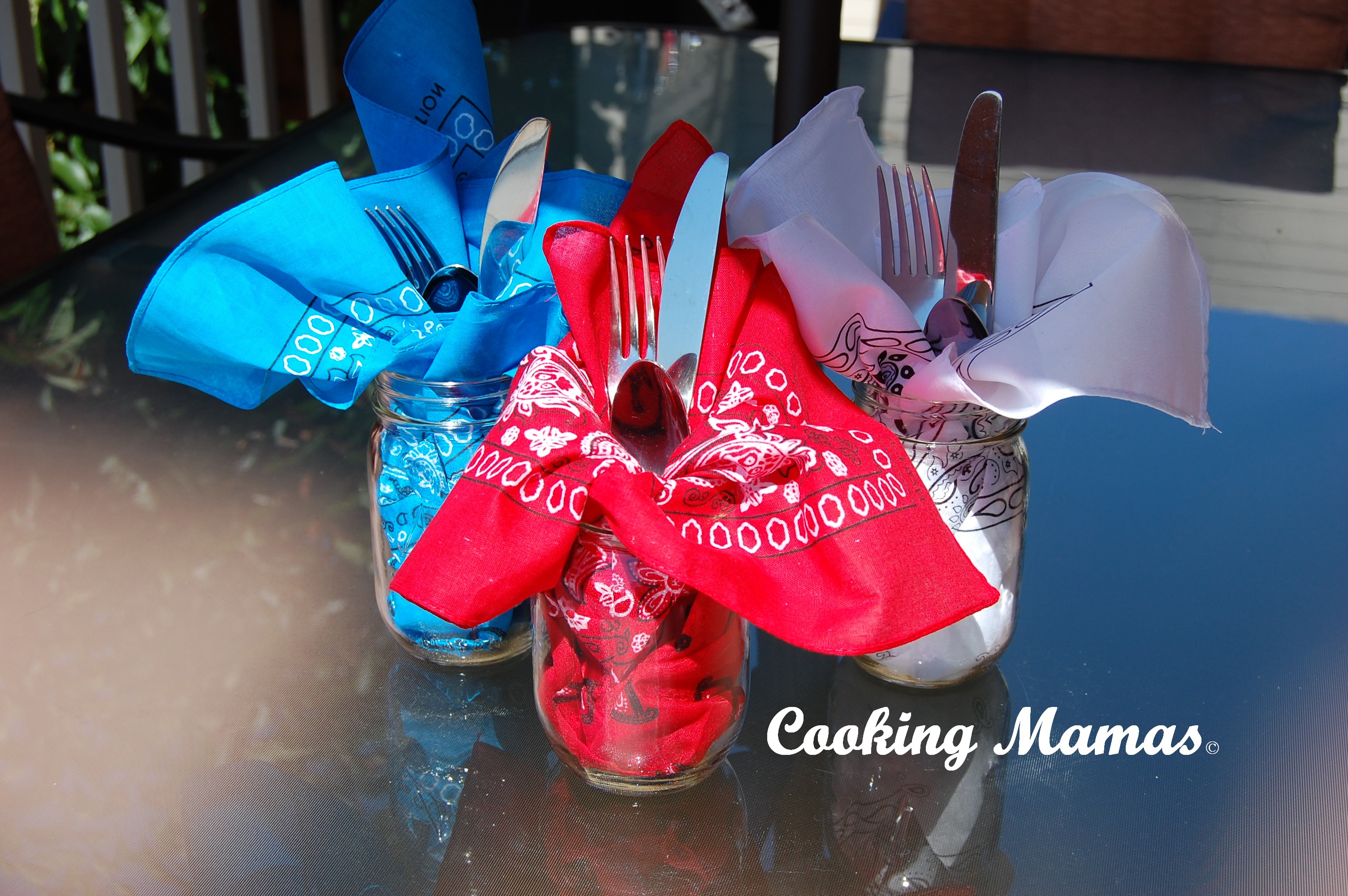 4th of July Jars July 2, 2013 By Cooking Mamas Leave a Comment How cute is this!?! Silverware wrapped in red, white, and blue bandana napkins, tucked in Mason drinking jars. Perfect for a 4th of July party!