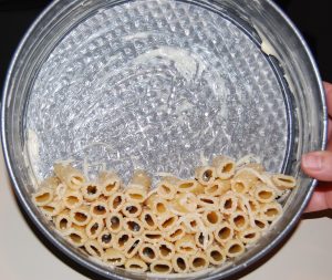 - Drain the pasta and immediately rinse under cold water. Pour the pasta back into the pot. Add olive oil, 1/2 cup Parmesan cheese and 1/2 cup Mozzarella cheese. Gently stir the pasta until evenly coated.