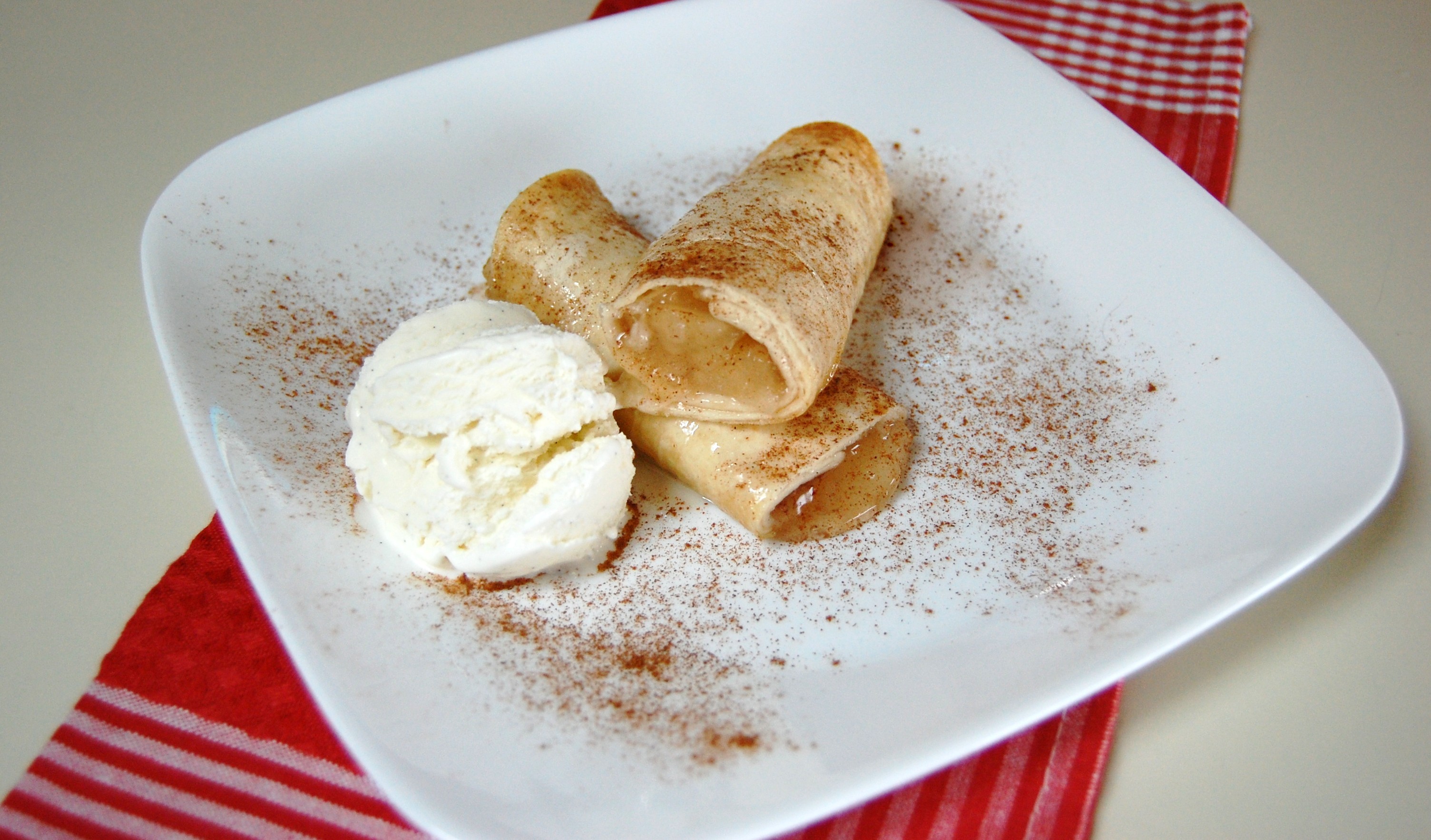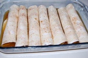 - Spoon one heaping 1/4 cup of pie filling evenly down the center of each tortilla. Sprinkle with cinnamon; roll up, tucking in edges; and place seam side down in prepared baking dish.