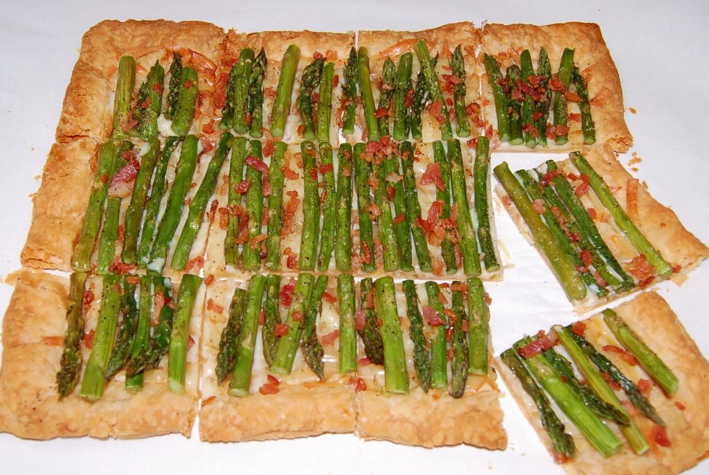 Puff pastry topped with Gruyere cheese, asparagus and prosciutto. A terrific way to start off a meal!