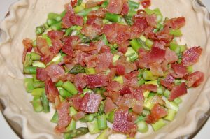 - Brush pie shell with beaten egg white. Sprinkle crumbled bacon and whole or chopped asparagus into pie shell.