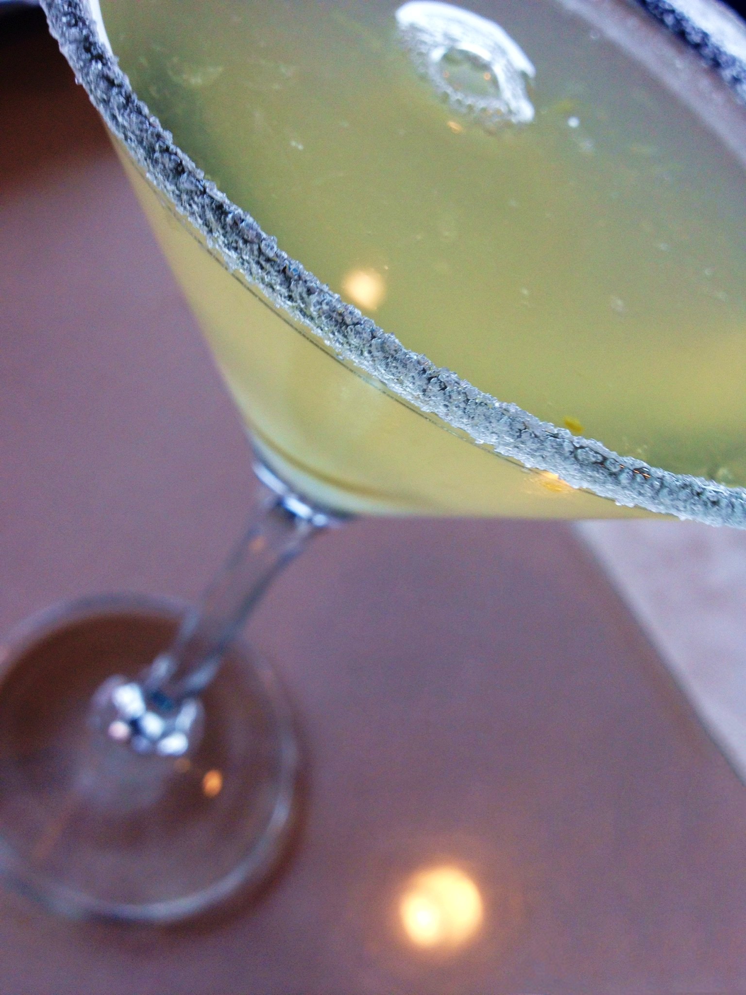 - Moisten the outer rim of a martini glass with the lemon wedge and coat lightly with sugar.