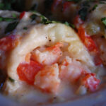 - In a large skillet, melt 2 tablespoons of butter. Sauté shrimp and 1/2 cup onion until shrimp are pink. Remove shrimp to a cutting board and chop; return to butter and onion. Add chopped tomatoes and 1/2 of the cheese sauce.