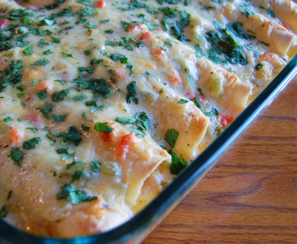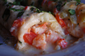 Sautéed shrimp and veggies rolled in flour tortillas smothered in a rich creamy sauce topped with pepper jack cheese.