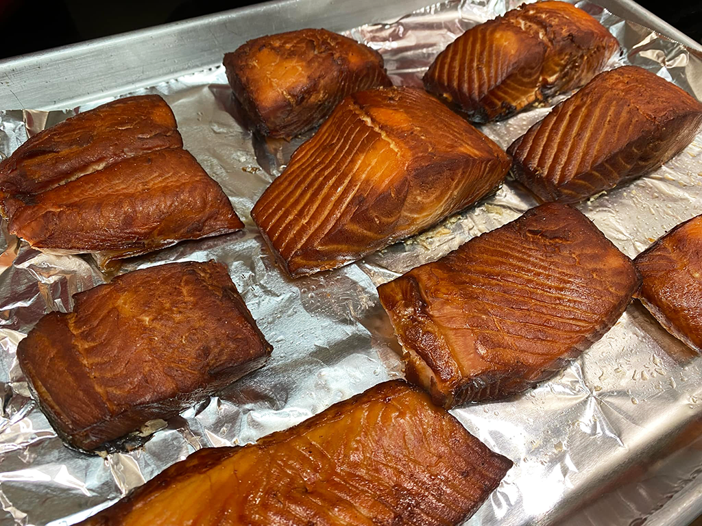 - Smoke salmon according to your smoker’s instruction manual. We like to use a combination of hickory and alder chips. Check fish frequently for doneness.