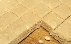 - Spread evenly into a wax paper lined 8 or 9 inch square baking pan. Set aside to cool.