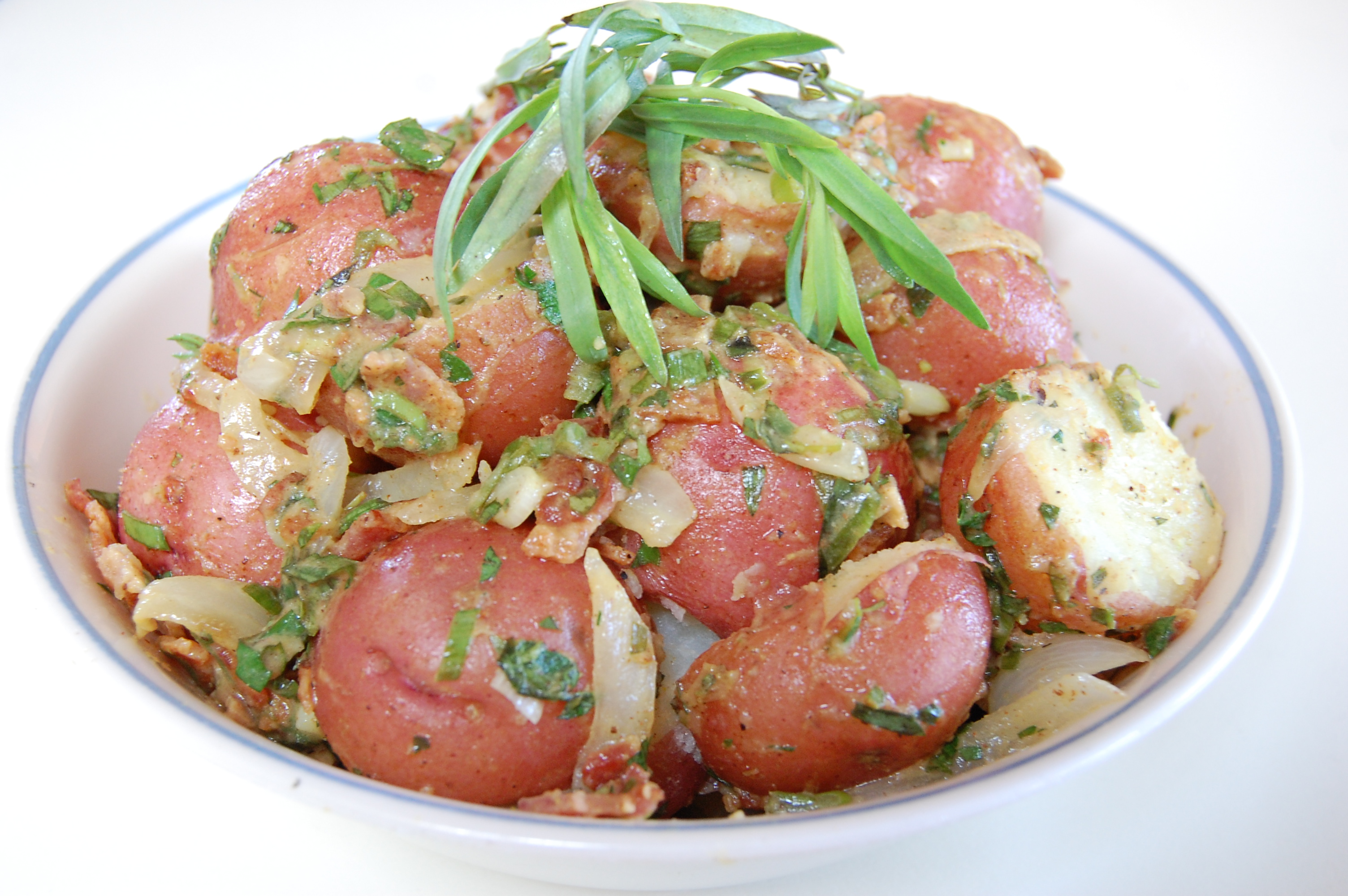 - Once the potatoes are cooked, drain them and add immediately to the pan with the sautéed bacon. Stir to coat. Add the green onion and fresh herbs, toss to combine. Season with more salt and pepper if desired. Serve warm or at room temperature.
