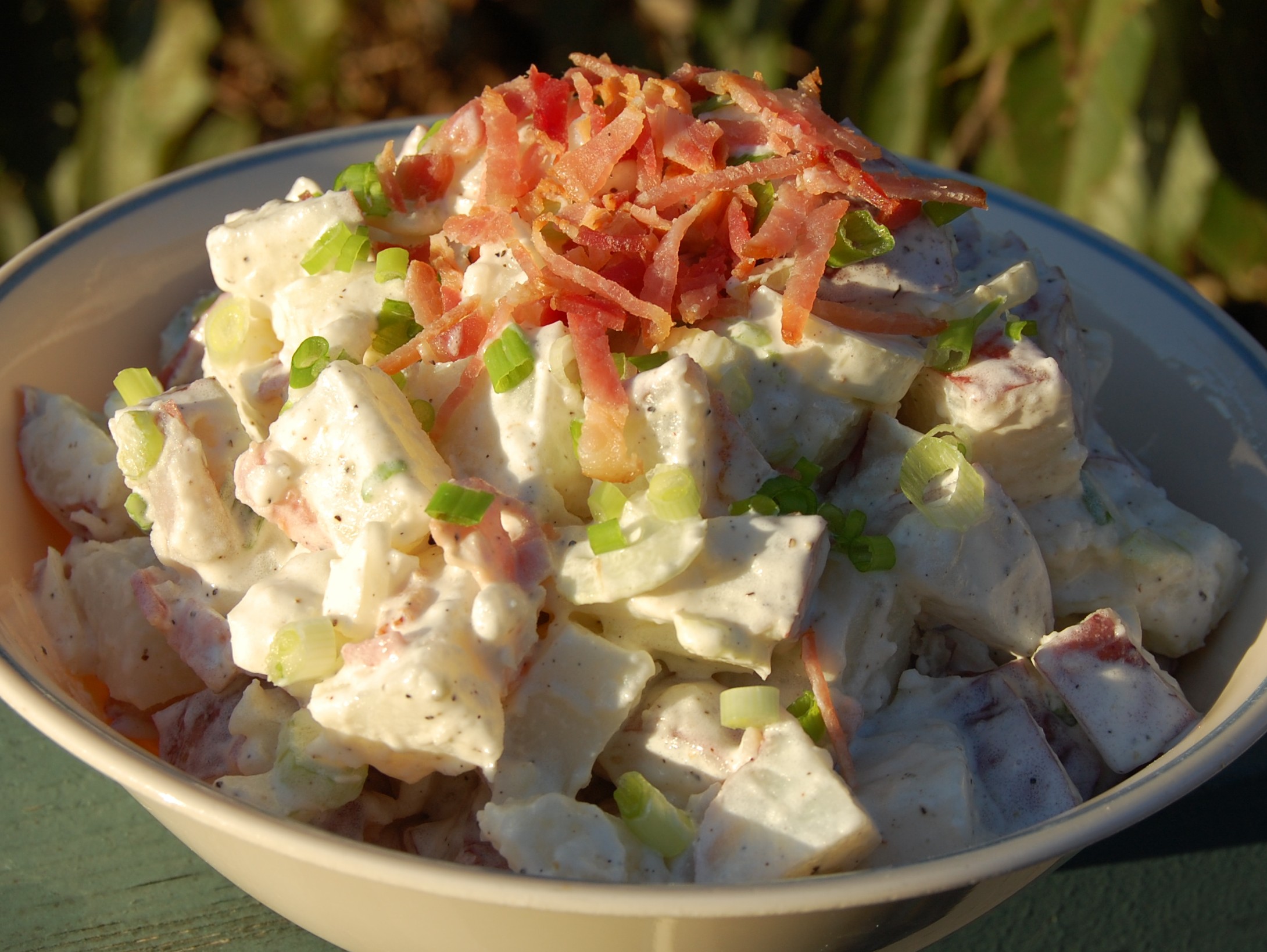 Red potatoes, celery, onion, and crispy bacon tossed in a homemade ranch dressing. A summertime favorite!!