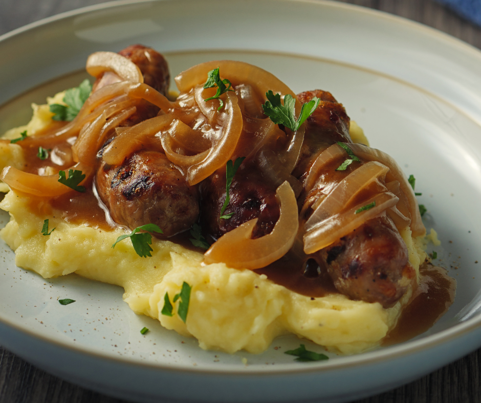 A traditional British-Irish dish, “Bangers” refers to the sausages that would bang or burst while cooking due to the rusk (dried bread) added to the meat. “Mash” is simply creamy mashed potatoes. Top it with traditional thin onion gravy and you have yourself a delicious comforting meal!