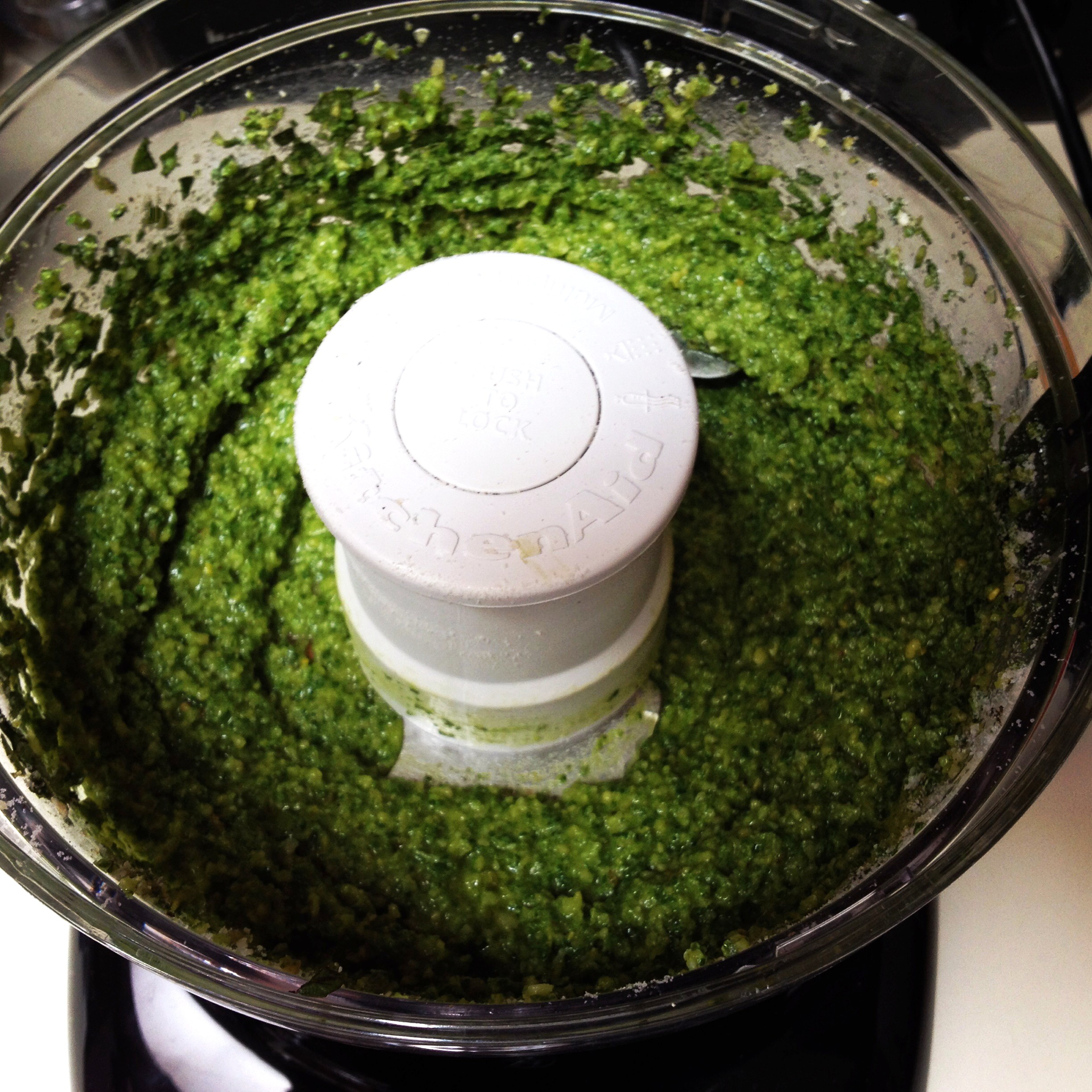 - Slowly add the olive oil in a constant stream while the food processor is on. Stop to scrape down the sides of the food processor with a rubber spatula. Add the grated cheese and pulse again until blended. Add a pinch of salt and freshly ground black pepper to taste.