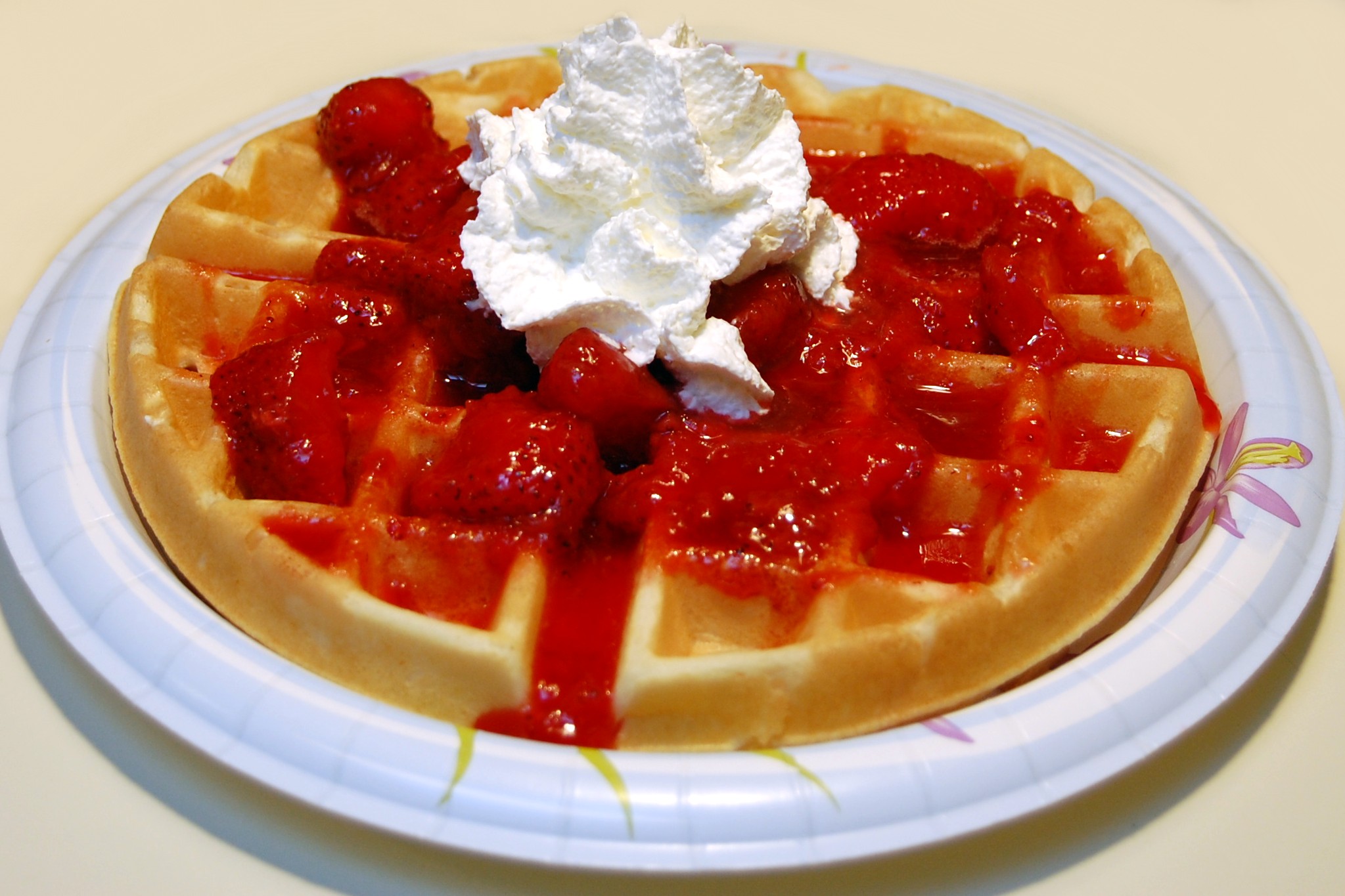 Homemade Belgian waffles topped with strawberries and whipped cream.