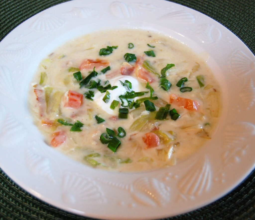 - Serve the soup in bowls topped with a dollop of the mayo/sour cream mixture. Garnish with crispy bacon crumbles and sliced green onions if desired. Enjoy!