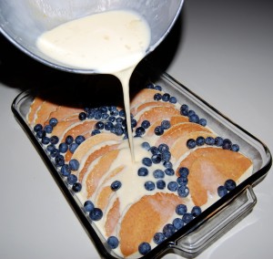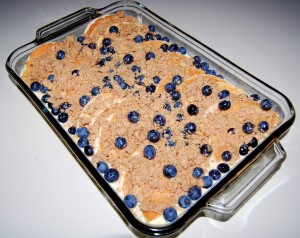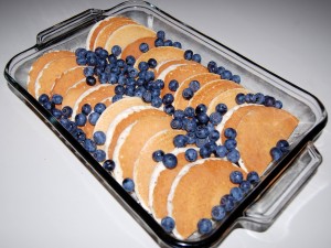 - Spray a 9 x13-inch baking dish with non-stick spray. Cut pancakes in half. Arrange in prepared baking dish in two rows, with cut side down. Sprinkle blueberries over pancakes.