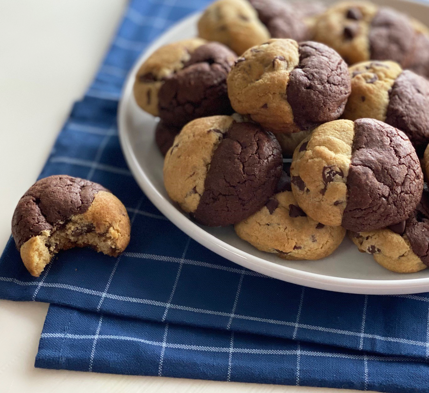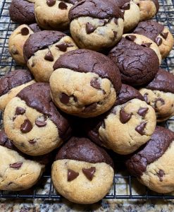 - Press a chocolate chip cookie dough ball and brownie dough ball together and roll between your palms into a ball. Repeat with remaining dough balls. Place dough balls about two inches apart on prepared baking sheets (8 per sheet pan) and bake for 10-12 minutes or until well puffed and lightly golden on the edges of the chocolate chip cookie halves.