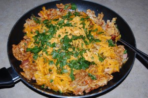 - In a large bowl, lightly whisk the eggs. Whisk in the taco seasoning. When the hash browns have browned, push them to one side and add the eggs into the skillet. Cook, stirring frequently, until the eggs have set. Stir in cooked chorizo, green chiles, cheese and cilantro.