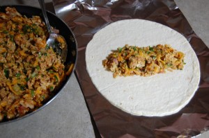 - Warm the tortillas. Place 1/8 of the egg mixture down the center of each tortilla. Roll up like a burrito and wrap tightly in heavy duty foil. Store in a Ziploc bag in the refrigerator or cooler until ready to serve.