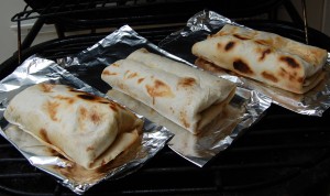 - When ready to cook, place wrapped burritos in hot coals next to fire. Let the burritos sit in the coals, turning once, until heated through, about 10-15 minutes. (The time will depend on how hot your fire is.) Or cook on an outdoor grill.
