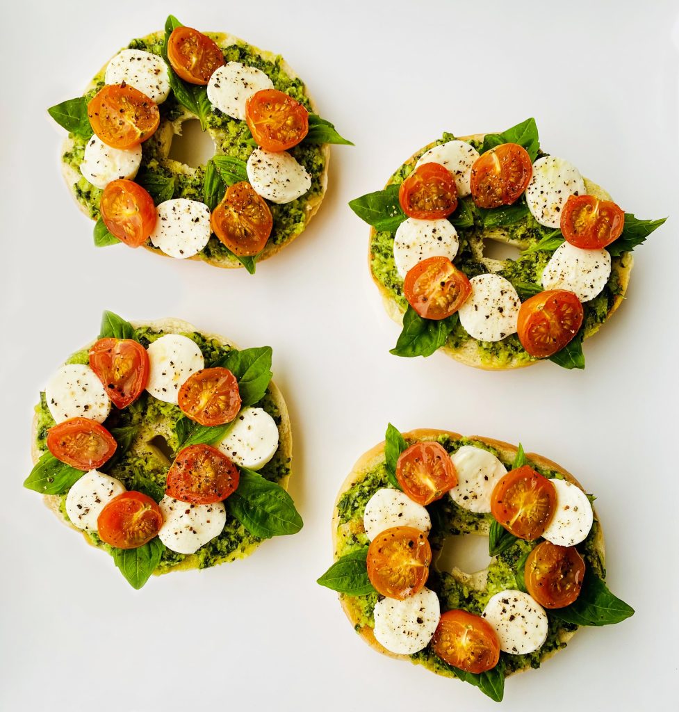 Toasted bagels topped with homemade pesto, roasted tomatoes, mozzarella, and fresh basil leaves, Enjoy!