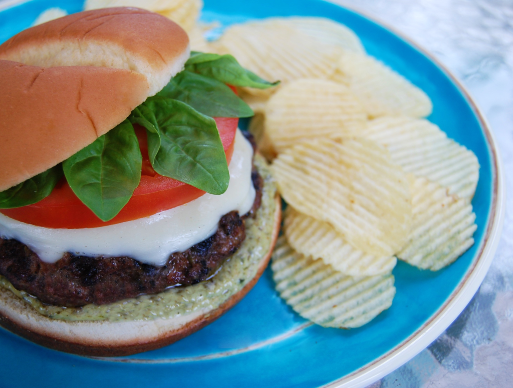 Inspired by my favorite salad, these burgers are topped with fresh mozzarella cheese, beefsteak tomatoes, and homemade basil pesto, Enjoy!