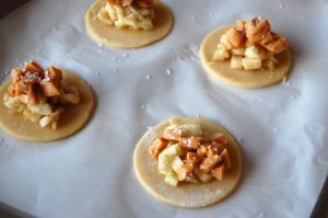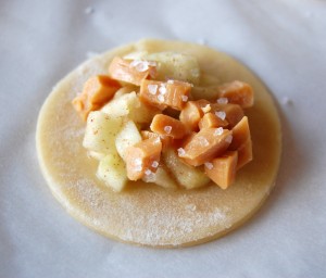 - Place six of the dough circles onto one of the prepared baking sheets. Spoon a small portion of the apple filling into the center of each circle, leaving enough of a border around the filling. Top the apple filling with a portion of the chopped caramels and a pinch of sea salt. Place a second dough circle atop each filled circle, then use a fork to crimp the edges together, sealing each pie.