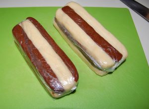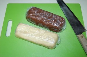 - Remove the chocolate dough from the mixer and shape into a squared off block, about 2-inches tall and wide, and 6 inches long. Do the same with the vanilla dough. Wrap both chocolate and vanilla dough in plastic wrap, separately, place on a baking sheet and refrigerate for 1 hour.