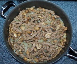 - Push the onions and mushrooms to one side. Add the steak and Worcestershire sauce; season the steak with salt and pepper. Continue to cook, stirring occasionally for 3 minutes. Sprinkle with Italian seasoning; stir everything together until well combined. Remove from heat.