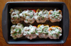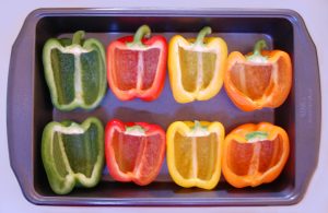 - Place peppers cut side up in a 9 x 13-inch baking dish, bake until tender about 30 minutes.