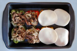 - To Assemble: Add 1 slice provolone cheese to the bottom of each baked peppers and fill with steak mixture. Top with another piece of provolone.