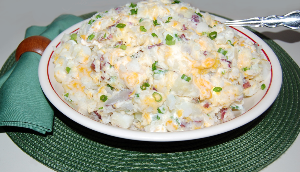 Smashed baby red potatoes with sour cream, cheddar cheese, and chives, Enjoy!