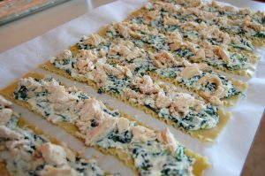 - In a large bowl, combine spinach, green onions, ricotta cheese, Parmesan cheese, salt and egg; mix well. Evenly spread the ricotta cheese mixture and shredded chicken down the center of each lasagna noodle. Roll up, jelly-roll style; place seam-side down in dish. Spoon remaining sauce over rolls and sprinkle with mozzarella cheese.