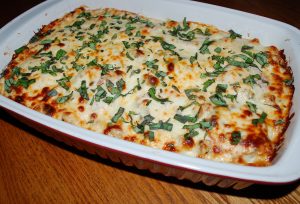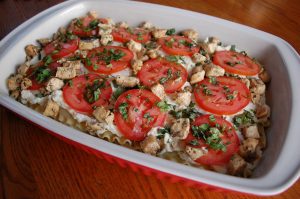 Creamy white chicken lasagna with fresh tomato, basil and 3 kinds of cheese!