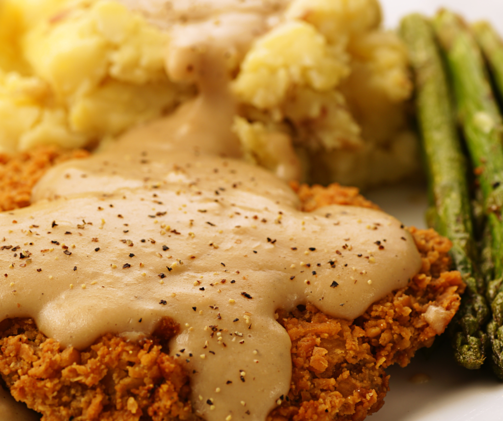 Beef sirloin steak, battered and fried, served over creamy mashed potatoes, then smothered with country gravy.