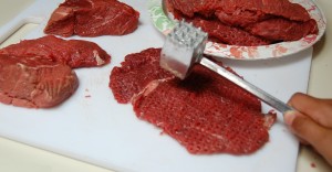 - Place steaks on a clean work surface and pound both sides to 1/4-inch thickness with the tenderizing side of a meat mallet. Season steaks with 1 teaspoon salt and 1/4 teaspoon pepper.