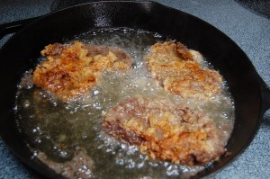 - Preheat oven to 200 degrees. Pour oil to 1/2-inch depth into a large cast-iron skillet and heat over medium-high heat. When oil shimmers, fry the steaks in two batches, turning once, until golden brown on both sides, about 3 minutes per side. Transfer to a paper towel-lined baking sheet to drain and place in the oven to keep warm (Do not cover). Repeat steps.