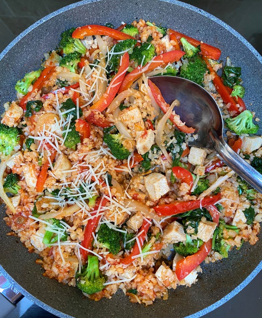 Healthy eating doesn’t have to be boring! Riced cauliflower topped with tender chicken breast, mixed veggies, zesty marinara sauce, and parmesan cheese, Enjoy!