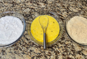 - Dip the chicken cutlets into the flour, then the egg mixture, then the breadcrumbs; repeat.