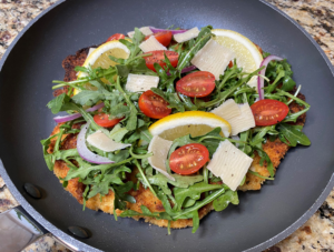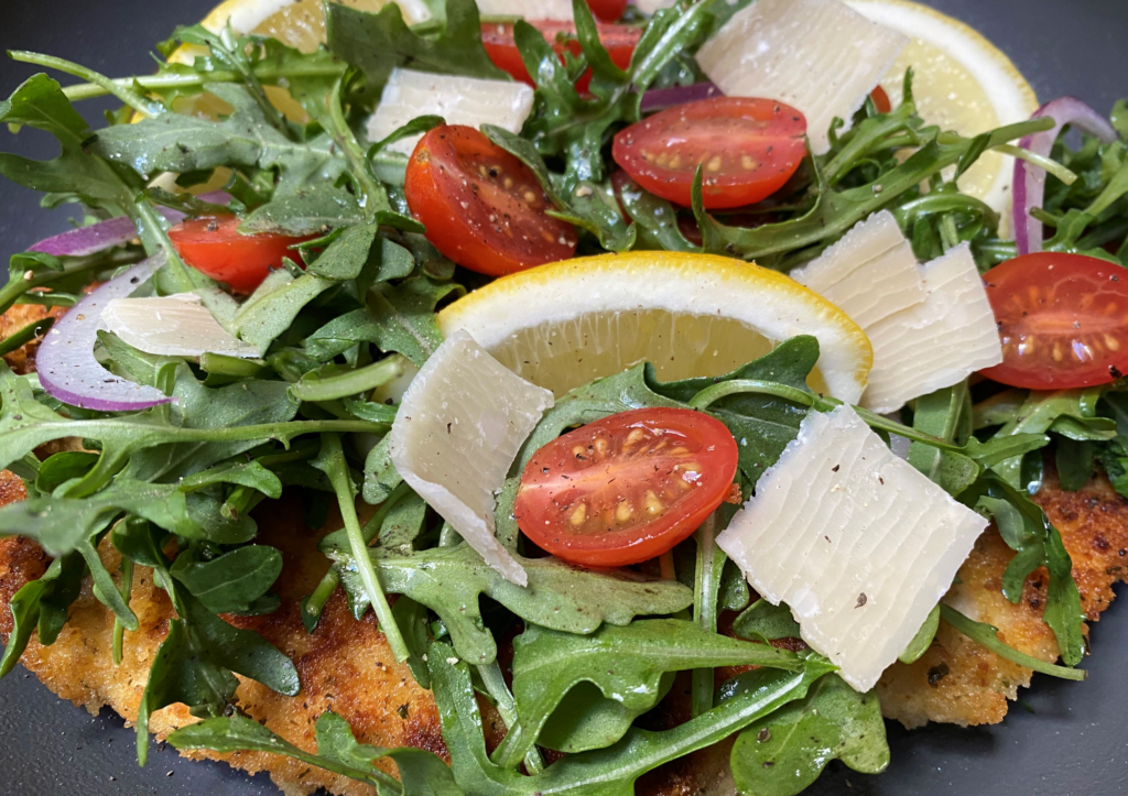 Tender chicken cutlets coated with seasoned breadcrumbs, pan fried until golden brown and crispy, then topped with a light lemony arugula salad, Enjoy!