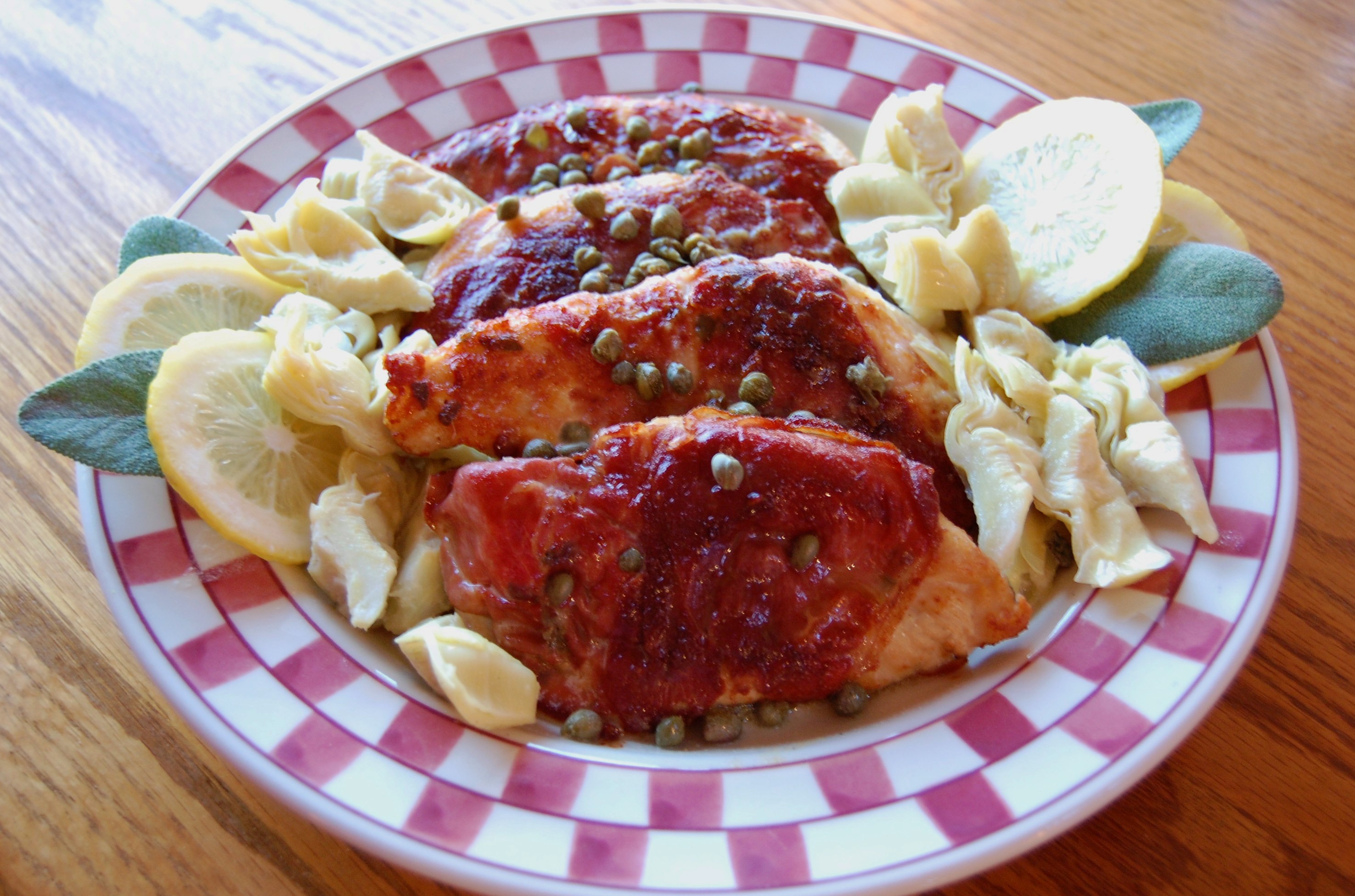 Pan-seared chicken wrapped with prosciutto and sage served with artichokes and capers then finished with white wine and lemon butter sauce, it's absolutely delicious!
