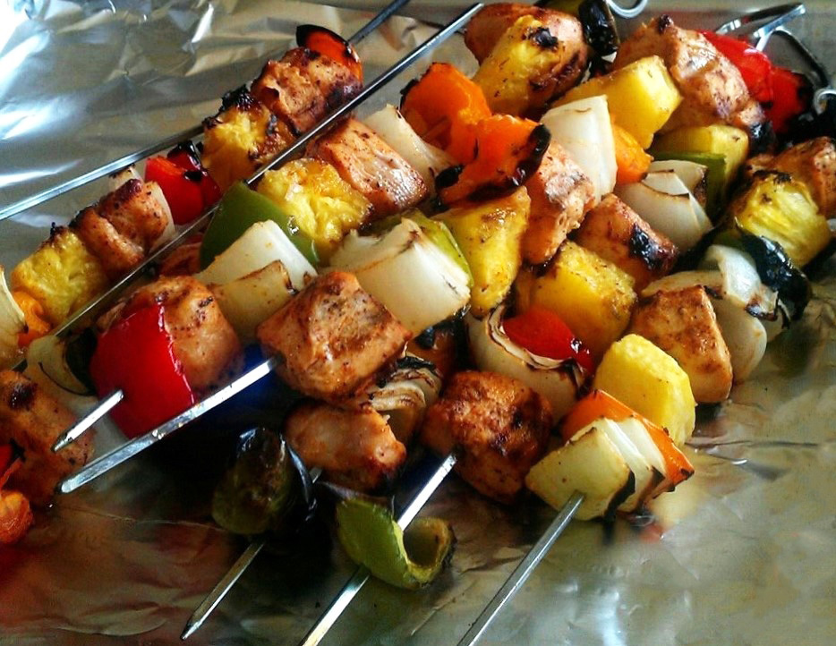 - COOK’S NOTE: Alternate pineapple, mushrooms, onions, zucchini, or red and green peppers cut into 1 to 1 1/2-inch pieces onto skewers with marinated chicken before cooking.