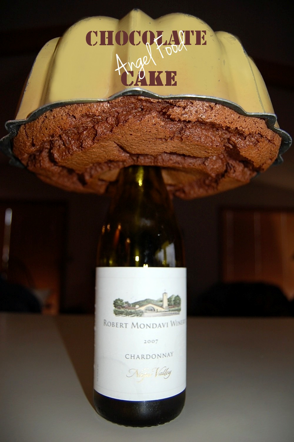 - Combine cake mix and cocoa in large mixing bowl. Prepare and bake according to cake mix package directions. Cool completely. (I do this over a wine bottle)