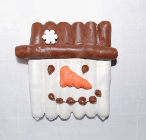 - Using a fork, dip one whole pretzel in dark chocolate and set it across the snowman creating the brim of the hat. Refrigerate for a few minutes until hardened.