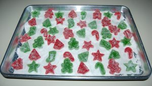 - Use mini Christmas cookie cutters dipped in sugar to cut out gumdrops.