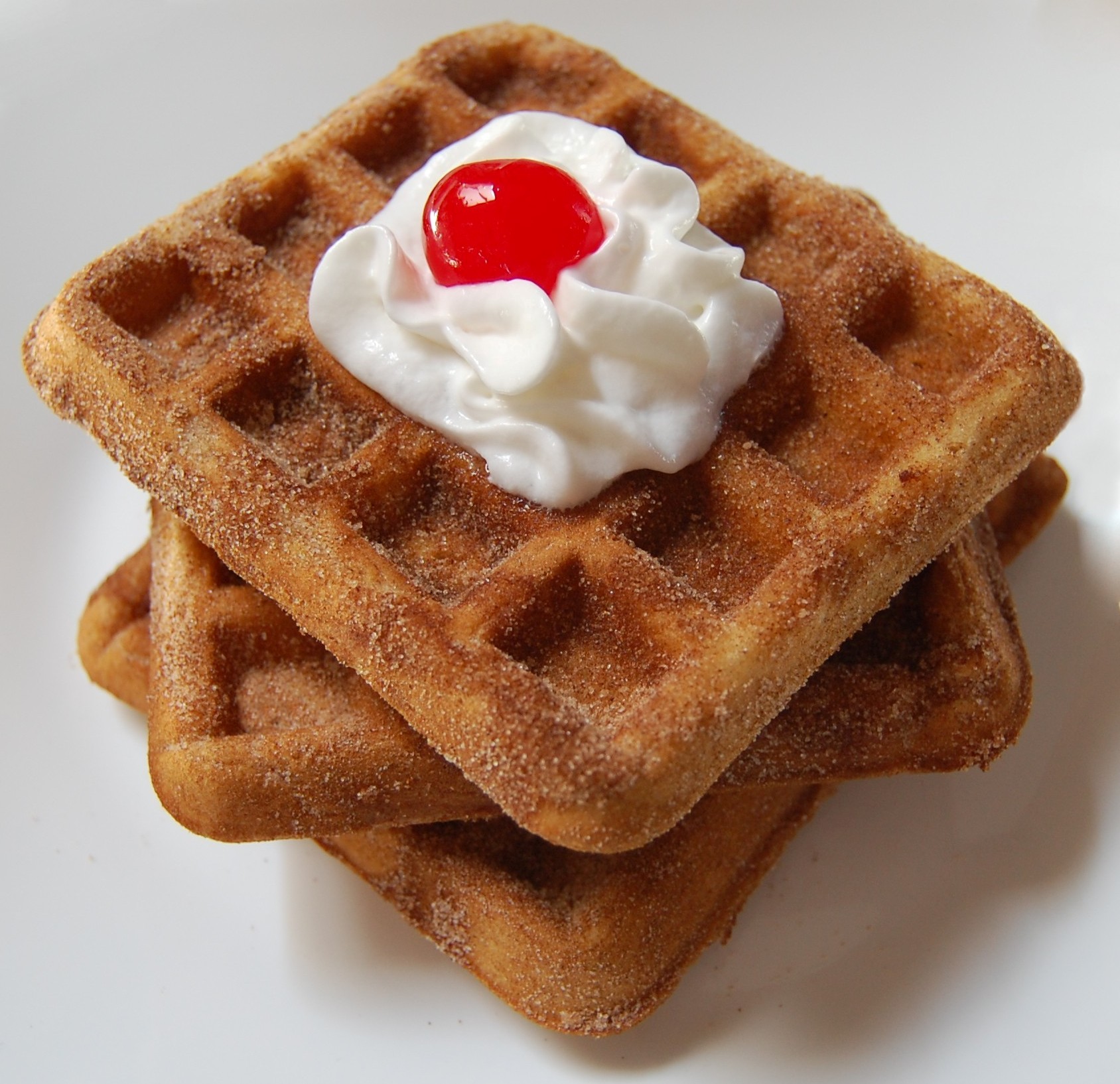 These cinnamon-sugared waffles topped with whipped cream and cherries are crunchy, sweet, and delicious!