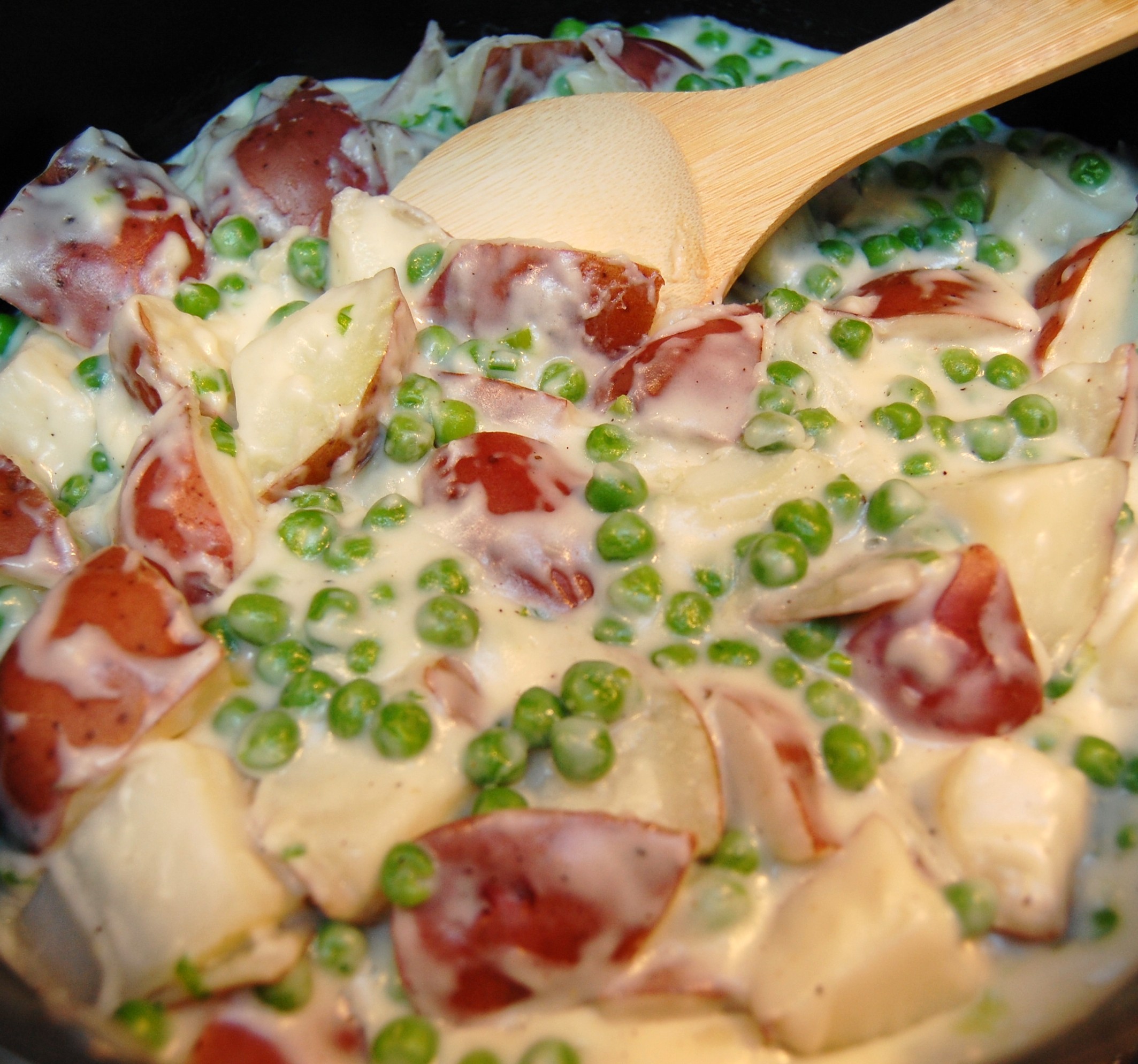 - Add peas, cook 3-5 minutes longer or until vegetables are tender. Drain potatoes and peas, set aside.