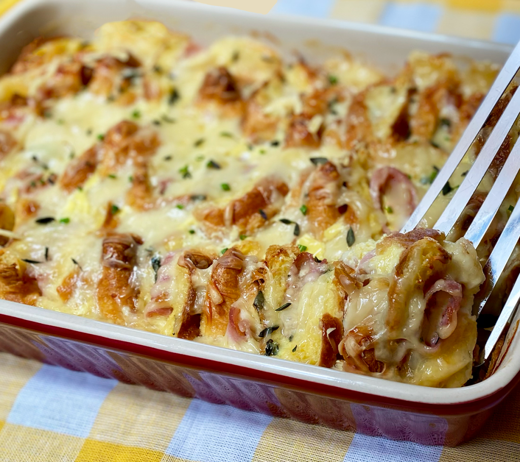 A classic French bistro sandwich made into a divine casserole featuring ham and Gruyere cheese baked in a rich and creamy custard. Serve with a side with of raspberry jam and a dusting of confectioners’ sugar or drizzle with maple syrup, Enjoy!