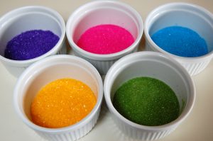 • Sugar sprinkles pink, purple, yellow blue, and green for rolling