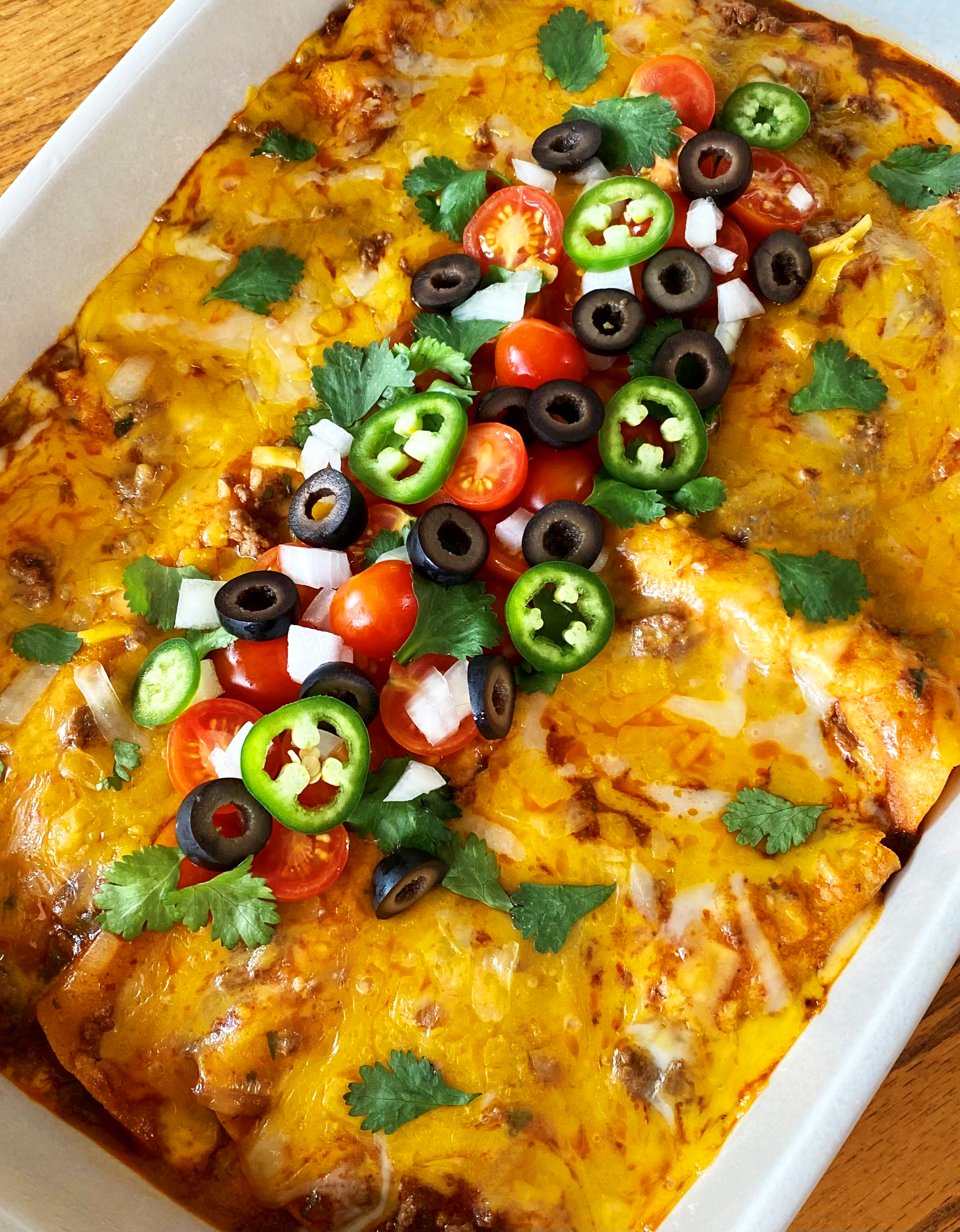 - Spread a 1/2 cup of enchilada sauce evenly over the bottom of a 9×13-inch casserole dish.