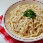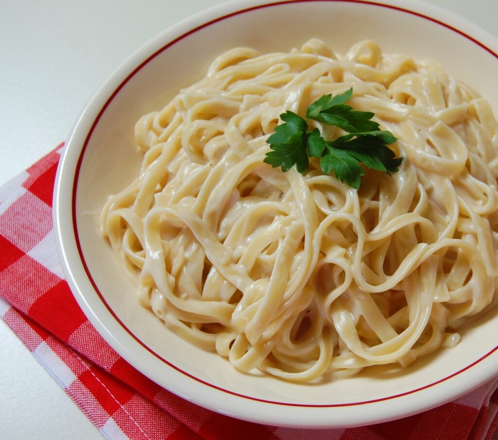 Fettuccine noodles tossed with cream, butter, and parmesan cheese. Stir in crispy bacon or pancetta and sliced mushrooms to create a hearty meal!