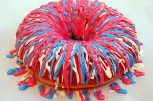 - When the cake is cool, divide the frosting evenly into 3 microwavable bowls. Microwave 1 bowl of frosting uncovered on High for a few seconds until smooth enough to drizzle over the cake. With a spoon, drizzle all of the white frosting back and forth around the cake in a striping pattern. Repeat microwaving the second bowl of frosting until smooth. Stir in blue food color until the desired color is achieved. Drizzle over cake, scattering frosting back and forth. Repeat with the remaining bowl of frosting and red food color, making sure red, white, and blue frostings can be seen on the cake.