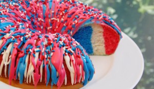 - Pour the red cake batter into the bottom of the pan. Carefully pour the remaining white batter over the red batter in the pan. Carefully pour blue batter over white batter. (The blue batter does not need to cover the white batter; it looks better if it just forms a ring in the center of the white batter. The idea is that the cake forms 3 horizontal layers, but for some reason, mine formed vertical layers as shown in the photo. Either way, it comes out beautiful.)